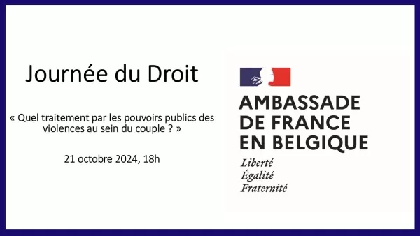 L’Ambassade de France en Belgique, la représentation du CNRS à Bruxelles et Aix Marseille Université vous invitent le 21 octobre 2024 à la « journée du Droit » à Bruxelles consacrée au traitement par les pouvoirs publics des violences au sein du couple.